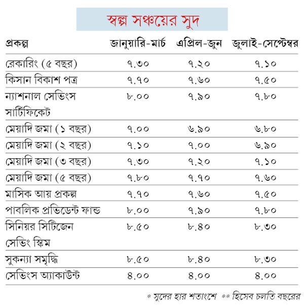 গত এপ্রিলে প্রথম বার জনপ্রিয় পিপিএফ অ্যাকাউন্টের সুদ নেমে এসেছিল ৮ শতাংশের নীচে। জুলাইতে নামে আরও এক ধাপ। শুধু পিপিএফ নয়, সুদ কমে প্রায় সবক’টি স্বল্প সঞ্চয় প্রকল্পেই। এর মধ্যে আছে ডাকঘর মাসিক আয় প্রকল্প, প্রবীণ নাগরিক সঞ্চয় প্রকল্প, এনএসসি, কিসান বিকাশ পত্র, সুকন্যা সমৃদ্ধি ইত্যাদি (সুদ কী ভাবে কমছে, তা দেখানো হল সঙ্গের সারণিতে)।