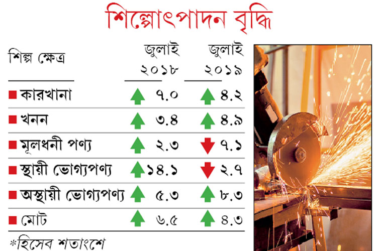 বিভিন্ন ক্ষেত্রে চাহিদা কমায় ধাক্কা খেয়েছে অর্থনীতি। এই অবস্থায় শিল্পকে চাঙ্গা করতে সম্প্রতি একাধিক পদক্ষেপ ঘোষণা করেছে কেন্দ্র। এরই মধ্যে গত সপ্তাহে প্রকাশিত হয়েছে কলকারখানায় উৎপাদন বৃদ্ধির পরিসংখ্যান। জুনের (১.২%) তুলনায় জুলাইয়ে উৎপাদন বেড়েছে অনেকটাই (৪.৩%)। যদিও এই বৃদ্ধি আগের বছরের জুলাইয়ের (৬.৫%) তুলনায় কম। আসলে বিভিন্ন পণ্যের চাহিদার পতনে উৎপাদন ছাঁটাই করতে বাধ্য হচ্ছে একাধিক শিল্প। এই পরিস্থিতিতে অনেকেই মনে করছেন, অক্টোবরে রিজার্ভ ব্যাঙ্কের পরবর্তী ঋণনীতিতে আরও এক দফা সুদ ছাঁটাই অবশ্যম্ভাবী। চাহিদা বৃদ্ধির তাগিদে ব্যাঙ্কের সুদ কমানো ও বাজারে নগদের জোগান বাড়াতেই তা করা হতে পারে। তা ছাড়া অগস্টে খুচরো মূল্যবৃদ্ধির হার ছিল ৩.২১%। যা রিজার্ভ ব্যাঙ্কের লক্ষ্যমাত্রার অনেকটাই নীচে। ফলে সুদ কমানোর অনুকূল পরিস্থিতি রয়েছে। শিল্পও তাকিয়ে রয়েছে সে দিকে।