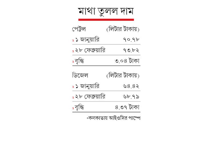 শুধু ফেব্রুয়ারিতেই বিশ্ব বাজারে তেলের দাম বেড়েছে ব্যারেলে ৫ ডলার। সেই সঙ্গে চড়েছে পেট্রল-ডিজেলের দর। আর ডলারে কমেছে টাকা। যার ছাপ পড়ছে দেশে পেট্রোপণ্য দু’টির দামে।