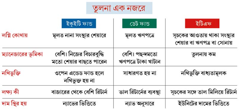 মিউচুয়াল ফান্ডের জগতে ইটিএফের জায়গা কিছুটা স্বতন্ত্র। বিভিন্ন ধরনের ফান্ডের বৈশিষ্ট্য এর মধ্যে দেখতে পাওয়া যায়। যেমন—