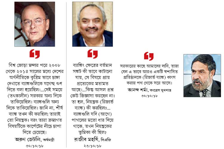 অর্থমন্ত্রী বলেন, বিশ্ব জোড়া মন্দার পরে অর্থনীতিকে কৃত্রিম ভাবে চাঙ্গা দেখাতে ব্যাঙ্কগুলিকে যথেচ্ছ ধার দিতে বলেছিল তৎকালীন সরকার। মূলত সেই কারণেই ব্যাঙ্ক-ঋণে বৃদ্ধির হার ১৪% থেকে বেড়ে হয় ৩১%। কিন্তু তা করতে গিয়ে এমন বহু প্রকল্পে ঋণ দেওয়া হয়েছিল, যেখান থেকে তা আর ফেরত পাওয়া যায়নি। তারই খেসারত হিসেবে ওই সময়ে অনুৎপাদক সম্পদ ২.৫ লক্ষ কোটি টাকা থেকে বেড়ে ৮.৫ লক্ষ কোটি ছুঁয়েছিল বলে তাঁর অভিযোগ। এখানেই শীর্ষ ব্যাঙ্কের ভূমিকা নিয়ে প্রশ্ন তুলেছেন জেটলি। তাঁর কটাক্ষ, ‘‘জানি না রিজার্ভ ব্যাঙ্ক কী করছিল! তারাই তো ব্যাঙ্কিং ক্ষেত্রের নিয়ন্ত্রক।’’