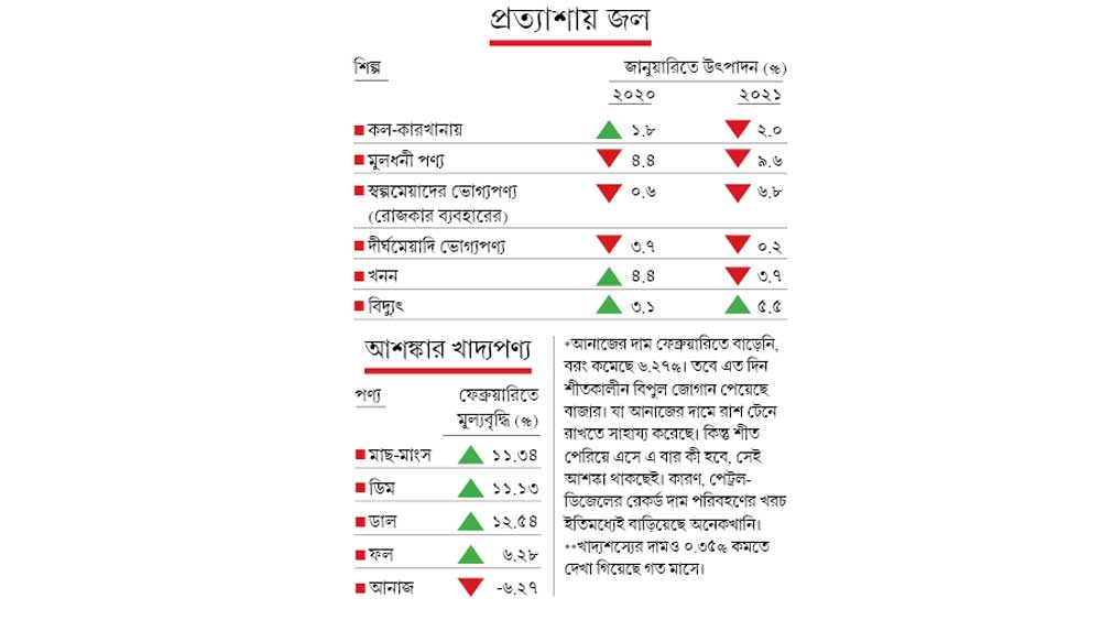ডিসেম্বরে শিল্প বৃদ্ধি দেখেছিল। জানুয়ারিতে ফের সঙ্কোচন। বাজারে চাহিদা বৃদ্ধির প্রত্যাশায় জল ঢেলে কল-কারখানায় উৎপাদন কমেছে। মূলধনী পণ্য, ভোগ্যপণ্য এবং খননেও উৎপাদন বাড়েনি। যা অর্থনীতির ঘুরে দাঁড়ানোর লক্ষণ নয়। অন্য দিকে ফেব্রুয়ারিতে খুচরো মূল্যবৃদ্ধির হারও তিন মাসে সর্বোচ্চ, ৫.০৩%। দুশ্চিন্তা কয়েক গুণ বাড়িয়েছে খাদ্যপণ্যের মূল্যবৃদ্ধি।