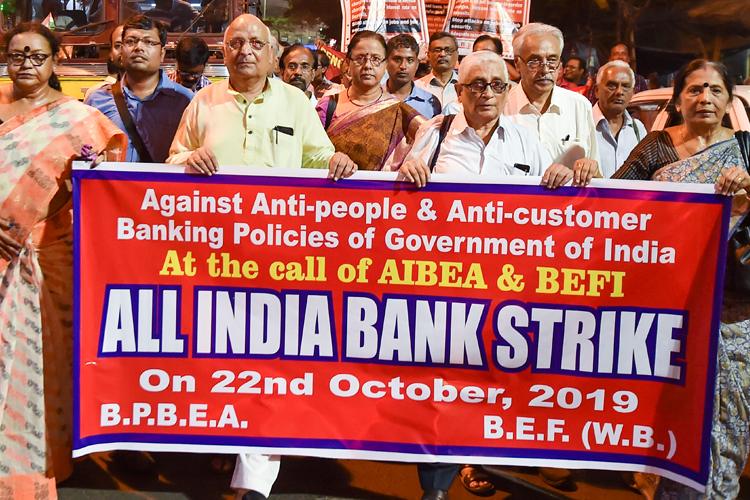 ব্যাঙ্ক ধর্মঘটের পক্ষে কলকাতায় মিছিল। ছবি: পিটিআই
