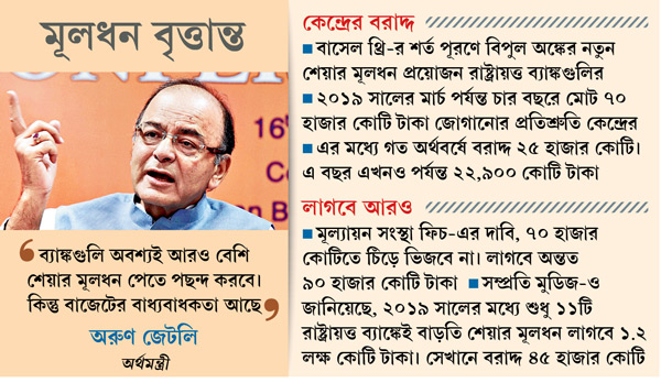এমনিতেই ২০১৯ সালের মার্চ পর্যন্ত চার বছরে রাষ্ট্রায়ত্ত ব্যাঙ্কগুলিকে বাড়তি শেয়ার মূলধন জোগাতে ৭০ হাজার কোটি টাকা বরাদ্দ করেছে কেন্দ্র। গত অর্থবর্ষে ২৫ হাজার কোটি দেওয়া হয়েছে। চলতি আর্থিক বছরে এখনও পর্যন্ত জোগানো হয়েছে আরও ২২,৯০০ কোটি টাকা। কিন্তু ফিচ, মুডিজের মতো আন্তর্জাতিক মূল্যায়ন সংস্থাগুলি মনে করে, রাষ্ট্রায়ত্ত ব্যাঙ্কগুলির আর্থিক স্বাস্থ্য মজবুত রাখতে হলে এর থেকে অনেকটাই বেশি পুঁজি জোগাতে হবে কেন্দ্রকে। কিন্তু এ দিন জেটলি ও অর্থ মন্ত্রকের কর্তাদের কথা থেকে স্পষ্ট যে, তাঁরা সেই যুক্তি মানতে নারাজ। বরং অনুৎপাদক সম্পদের সমস্যায় রাশ টেনে প্রয়োজনীয় বাড়তি পুঁজি নিজেদেরই জোগাড় করতে রাষ্ট্রায়ত্ত ব্যাঙ্ককে পরামর্শ দিয়েছেন অর্থমন্ত্রী। বলেছেন, ব্যাঙ্কগুলি যে আরও পুঁজি পেতে চাইবে তাতে সন্দেহ নেই। কিন্তু বাজেটেরও সীমাবদ্ধতা রয়েছে।