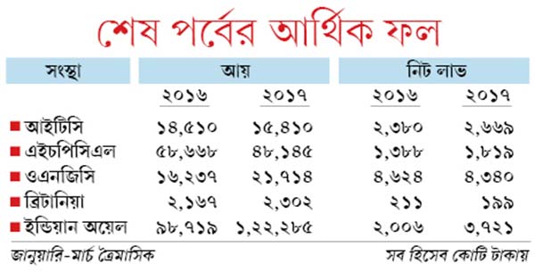 এই মরসুমে সংস্থার ফল প্রকাশ শেষ হতে আর মাত্র দু’দিন বাকি। এই দু’দিনে প্রকাশিত হবে একগুচ্ছ আর্থিক ফল। এগুলিও কিছুটা দিশা দেখাবে বাজারকে। গত সপ্তাহেও প্রকাশিত হয়েছে বেশ কয়েকটি ফলাফল। এদের মধ্যে আছে আইটিসি, এইচপিসিএল, ইন্ডিয়ান অয়েল, গেইল, ওএনজিসি, গোদরেজের মতো বড় সংস্থা। দু’একটি সংস্থা আশা না-মেটালেও ফল মোটের উপর ভাল। কিছু হিসেব দেওয়া হল সঙ্গের সারণিতে।