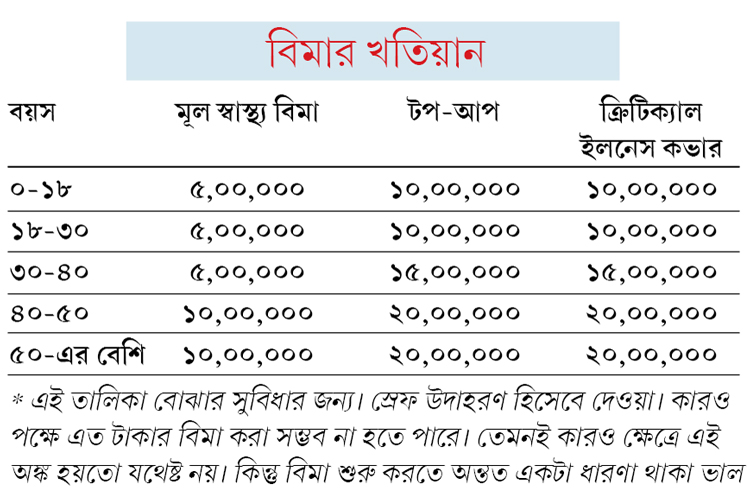 • আমি বলব, ২০ থেকে ৩০ বছর বয়সী ব্যক্তির স্বাস্থ্য বিমার অঙ্ক হওয়া উচিত অন্তত ৫ লক্ষ টাকা। এর সঙ্গে টপ আপ করান ১০ লক্ষের। আরও ১০ লক্ষের ক্রিটিক্যাল ইলনেস কভার নিন। প্রতি ১০ বছরে এই অঙ্ক দ্বিগুণ বাড়াতে হবে (সঙ্গের সারণি দেখুন)।