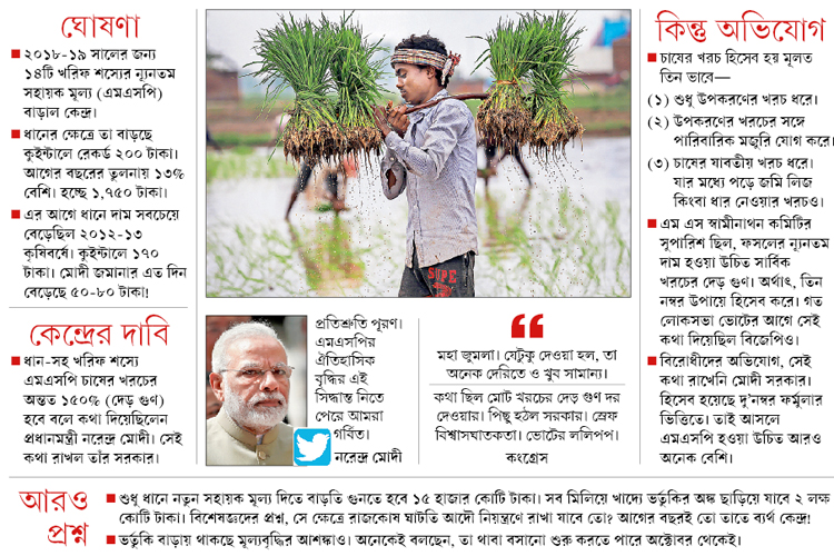 চাষিদের আয় ২০২২ সালের মধ্যে মোদী দ্বিগুণ করার স্বপ্ন দেখালেও, গত চার বছরে তাঁদের দাবি মতো ফসলের দাম বাড়েনি। কৃষিমন্ত্রী রাধামোহন সিংহ যুক্তি দিতেন, শুধু এমএসপি বাড়ালেই ওই আয় বাড়বে না। উল্টে গরিব কৃষকদেরই মূল্যবৃদ্ধির আঁচ পোয়াতে হবে। শেষে দেশ জুড়ে কৃষকদের আন্দোলনের মুখে গত বাজেটে অরুণ জেটলি ঘোষণা করেন, ফসলের দেড় গুণ দাম দেওয়ার কথা।
