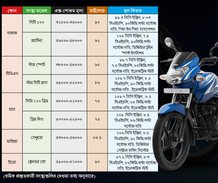তাই এক্ষেত্রে ১০০ সিসি-র বাইক নির্বাচন করা হল। দাম অনুযায়ী কোম্পানিগুলি উল্লেখ করা হল এবং সমস্ত দাম এক্স-শোরুম মূল্য, কারণ তার ওপর একাধিক জায়গায় একাধিক রকমের ট্যাক্স অনুযায়ী দামের তারতম্যহতে পারে। সমস্ত মাইলেজের হিসেব কোম্পানির তরফে উল্লিখিত, রোজকার সাধারণ ব্যবহারে অবশ্য এর থেকে কিছুটা কম হওয়াটাই স্বাভাবিক।