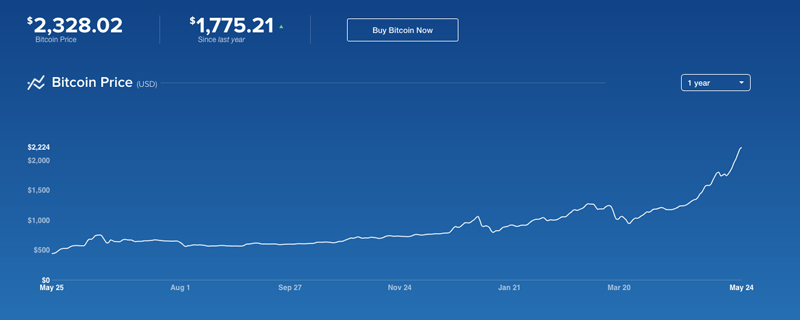 কয়েনবেস নামে একটি বিটকয়েন এক্সচেঞ্জ ওয়েবসাইটের তথ্য অনুযায়ী, শেষ এক মাসে প্রায় হাজার ডলারের বেশি দাম বেড়েছে প্রতি বিটকয়েনের। গত বছর মে মাসেই প্রতি বিটকয়েনের দাম ছিল ৪৪০ ডলারের কাছাকাছি। আর এ বছর মে-তে একের পর এক রেকর্ড উচ্চতায় পৌঁছে গিয়েছে বিটকয়েন।