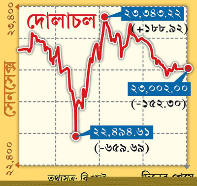 সারা দিনই ধন্দে ছিল বাজার। বাজেট পেশ করার সময়েই শেয়ার পড়তে শুরু করে। অর্থমন্ত্রী বাজেট বক্তৃতা শেষ করার অল্প কিছুক্ষণের মধ্যে দর হুড়মুড় করে পড়ে যায় প্রায় ৬৬০ পয়েন্ট। তবে বেলার দিকে বাজেটে বাজারের অনুকূলে কিছু বিষয় খুঁজে পাওয়ার পর সূচক সামান্য ঘুরে দাঁড়ায়।