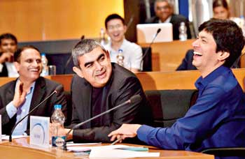 স্বস্তির হাসি। বিশাল সিক্কা (মাঝে), সিএফও রাজীব বনশল (ডান দিকে), সিওও প্রবীণ রাও।