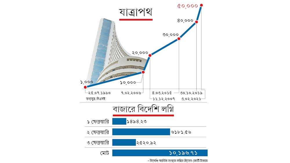 এর আগে ৫০,০০০ ছুঁয়েও নেমে এসেছিল সেনসেক্স। বুধবার আর নামল না। ইতিহাস গড়ে এই প্রথম দিনের শেষে দৌড় শেষ করল ৫০,০০০ পেরিয়ে। টানা তিন দিনে ঝুলিতে ভরল প্রায় ৪০০০ পয়েন্ট। লগ্নিকারীদের শেয়ার সম্পদ বাড়ল ১২.৩১ লক্ষ কোটি টাকারও বেশি।