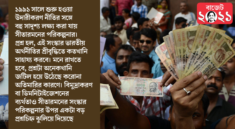 অতিমারির সময় কেন্দ্রীয় অর্থমন্ত্রীর ঘোষণা করা সংস্কারের পরিকল্পনার জন্মের প্রেক্ষিত কিন্তু এটাই। ১৯৯১ সালে শুরু হওয়া উদারীকরণ নীতির সঙ্গে বহু সাদৃশ্য লক্ষ্য করা যায় সীতারমনের পরিকল্পনার। এখন প্রশ্ন হল, এই সংস্কার ভারতীয় অর্থনীতির শ্রীবৃদ্ধিতে কতখানি সাহায্য করবে। মনে রাখতে হবে, এই প্রশ্নটা অনেকখানি জটিল হয়ে উঠেছে করোনা অতিমারির কারণে। বিমুদ্রাকরণ বা ডিমনিটাইজেশনের ব্যর্থতাও সীতারমনের সংস্কার পরিকল্পনার উপর একটা বড় প্রশ্নচিহ্ন ঝুলিয়ে দিয়েছে।
