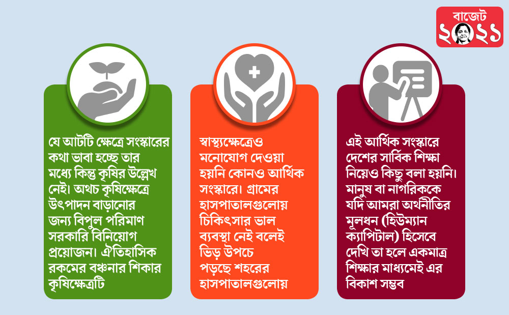 দ্বিতীয়ত, স্বাস্থ্যক্ষেত্রেও মনোযোগ দেওয়া হয়নি কোনও আর্থিক সংস্কারে। হতে পারে কেন্দ্রীয় অর্থমন্ত্রী ঘোষণা করেছেন যে হাসপাতালগুলিতে বেসরকারি বিনিয়োগ বৃদ্ধির জন্য উদ্যোগ নেওয়া হবে, এর জন্য আলাদা ভর্তুকির ব্যবস্থা করা হবে, কিন্তু দেশের বিপুল সংখ্যক মানুষের জন্য এমন একটা ব্যবস্থা কেমন করে করা যাবে বা আদৌ সেটা কতখানি সম্ভবপর তা নিয়ে কোনও নির্দিষ্ট রূপরেখা পাওয়া যায়নি। গ্রামীণ হাসপাতালগুলোয় চিকিৎসার সঠিক পরিকাঠামোই অনেক ক্ষেত্রে অনুপস্থিত। গ্রামের হাসপাতালগুলোয় চিকিৎসার ভাল ব্যবস্থা নেই বলেই ভিড় উপচে পড়ছে শহরের হাসপাতালগুলোয়। কিন্তু অতিরিক্ত ভিড়ের কারণেই হাসপাতালের পরিচ্ছন্নতা ও রোগীদের স্বাস্থ্যের নিরাপত্তা বজায় রাখা দুষ্কর হয়ে পড়ছে। এই যেখানে হাসপাতালের দশা সেখানে কোভিড টিকা সমাজের সমস্ত স্তরের মানুষের কাছে পৌঁছে দেওয়া কতখানি সম্ভবপর তা জোর গলায় বলা যাচ্ছে না। দেশে কোভিড পরীক্ষাও কিন্তু চালানো হয়েছে বেশির ভাগ ক্ষেত্রেই তুলনামূলক ধনী রাজ্যগুলিতেই।