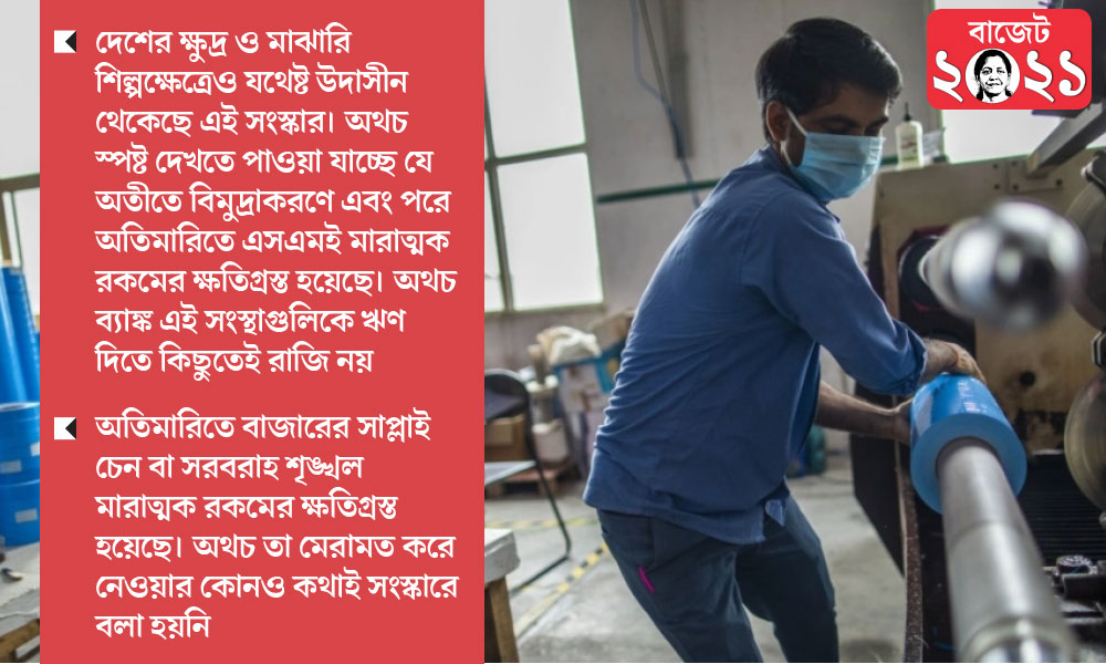 চতুর্থত, দেশের ক্ষুদ্র ও মাঝারি শিল্পক্ষেত্রেও (স্মল অ্যান্ড মিডিয়াম এন্টারপ্রাইজ বা এসএমই) যথেষ্ট উদাসীন থেকেছে এই সংস্কার। অথচ স্পষ্ট দেখতে পাওয়া যাচ্ছে যে অতীতে বিমুদ্রাকরণে এবং পরে অতিমারিতে এসএমই মারাত্মক রকমের ক্ষতিগ্রস্ত হয়েছে। অথচ ব্যাঙ্ক এই সংস্থাগুলিকে ঋণ দিতে কিছুতেই রাজি নয়। সংস্কার প্রক্রিয়ায় এই সব এসএমই-র জন্য কিছু ব্যবস্থা করতেই হবে, কারণ দেশের নানা ক্ষেত্রে নানা কিছুর জোগান দিয়ে সার্বিক উৎপাদনে এরাই অনুঘটক হিসেবে কাজ করে। দেশের কর্মসংস্থানের ক্ষেত্রেও এদের ভূমিকা নিয়ে কোনও প্রশ্ন নেই। তাই এসএমই-র ব্যাপারে সরকারকে আরও উদার হয়ে ভাবতে হবে। সরকার ভর্তুকির ব্যবস্থা করলে এবং ব্যাঙ্ক থেকে ঋণ পাওয়ার প্রক্রিয়া সহজতর করলে এসএমই-গুলি চাঙ্গা হওয়ার সুযোগ পেতে পারে।