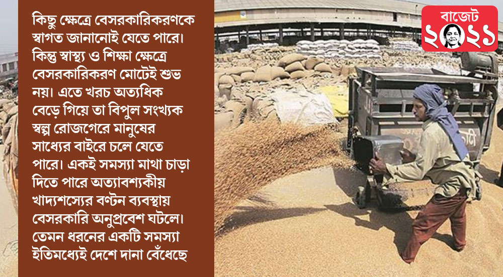 দেশের সংস্কারের অন্যতম বৈশিষ্ট্যই হল বহু ক্ষেত্রে ঢালাও বেসরকারিকরণ। এ ব্যাপারে ধরে নেওয়া হয় যে বেসরকারিকরণের মধ্য দিয়ে কর্মোদ্যম বাড়বে, নতুনত্ব আসবে এবং সর্বোপরি বিনিয়োগ বৃদ্ধি পাবে। কিছু ক্ষেত্রে বেসরকারিকরণকে স্বাগত জানানোই যেতে পারে। যেমন ধরা যাক ব্যাঙ্কিং। এই ক্ষেত্রে বেসরকারিকরণের মাধ্যমে অলাভজনক প্রকল্পগুলিতে অনর্থক ঋণ দেওয়া নিয়ন্ত্রণ করা যায়। সামগ্রিক পরিচালন ব্যবস্থাকে উন্নত করা যায়। কিন্তু স্বাস্থ্য ও শিক্ষা ক্ষেত্রে বেসরকারিকরণ মোটেই শুভ নয়। এতে খরচ অত্যধিক বেড়ে গিয়ে তা বিপুল সংখ্যক স্বল্প রোজগেরে মানুষের সাধ্যের বাইরে চলে যেতে পারে। একই সমস্যা মাথা চাড়া দিতে পারে অত্যাবশ্যকীয় খাদ্যশস্যের বণ্টন ব্যবস্থায় বেসরকারি অনুপ্রবেশ ঘটলে। তেমন ধরনের একটি সমস্যা ইতিমধ্যেই দেশে দানা বেঁধেছে।