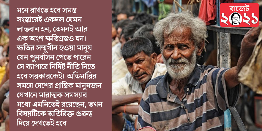 অর্থমন্ত্রীর প্রস্তাবিত সংস্কারের কিছু ইতিবাচক দিক অবশ্যই রয়েছে। কয়লা, খনিজ, শক্তি উৎপাদন, বিমান পরিবহণ, পারমাণবিক শক্তির মতো ক্ষেত্রগুলিতে গুরুত্ব বাড়ালে দেশের অর্থনীতিতে উৎপাদনের দিকটিতে উন্নতি ঘটবে, তাতে কোনও সন্দেহ নেই। কিন্তু সংস্কারে কোন কোন দিকগুলিতে ঘাটতি রয়েছে আর কোন ক্ষেত্রগুলি সর্বজনীন হবে সেটি পর্যালোচনা করে দেখা প্রয়োজন। সংস্কারের লক্ষ্য যদি হয় সুষম বৃদ্ধি তা হলে দেশের সমস্ত ক্ষেত্রের মানুষকে জড়িয়ে নিয়েই তা ভাবতে হবে, তা না হলে অর্থনীতির ভারসাম্য সঠিকভাবে রক্ষা করা যাবে না। এমন সর্বজনীন পরিকল্পনা তৈরি করাটা মোটেই সহজ কাজ নয়। বৃদ্ধি এবং অসাম্যের মধ্যে সামঞ্জস্য রাখাটা অত্যন্ত জরুরি। মনে রাখতে হবে সমস্ত সংস্কারেই একদল যেমন লাভবান হন, তেমনই আর এক অংশ ক্ষতিগ্রস্তও হন। ক্ষতির সম্মুখীন হওয়া মানুষ যেন পুনর্বাসন পেতে পারেন সে ব্যাপারে নির্দিষ্ট নীতি নিতে হবে সরকারকেই। অতিমারির সময়ে দেশের প্রান্তিক মানুষজন যেখানে মারাত্মক সমস্যার মধ্যে এমনিতেই রয়েছেন, তখন বিষয়টিকে অতিরিক্ত গুরুত্ব দিয়ে দেখতেই হবে। আগামী কেন্দ্রীয় বাজেটে এই সমস্ত দিকগুলিকে সরকার কতখানি বিবেচনার মধ্যে আনেন সেটাই এখন দেখার।