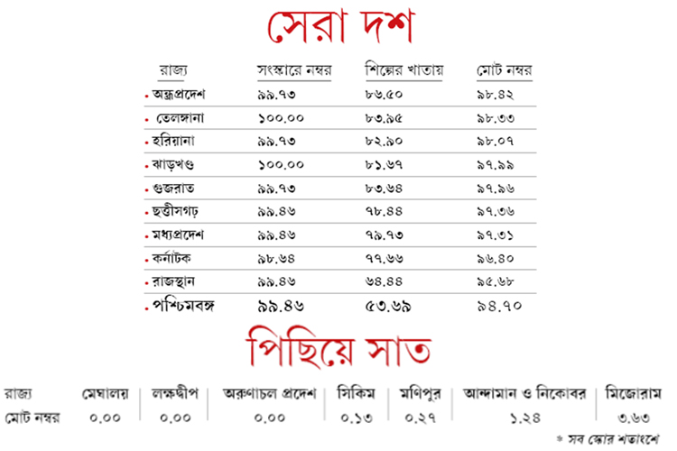 • শিল্পের খাতায় রাজ্যের পাওয়া নম্বর মাত্র ৫৩.৬৯। প্রথম দশে থাকা রাজ্যগুলির মধ্যে সবচেয়ে কম। সবার মধ্যে ১৩ নম্বরে।