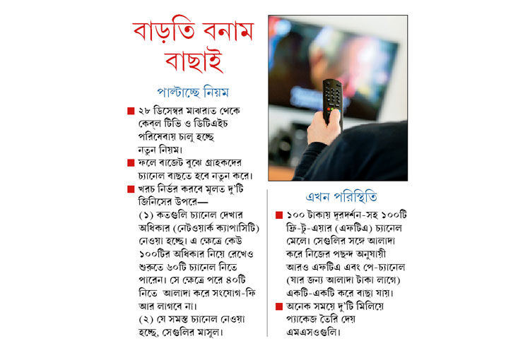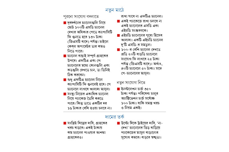 অনেক কেব্ল অপারেটর এবং গ্রাহকের আশঙ্কা, নতুন বিধিতে খরচ বাড়বে কেব্ল পরিষেবার। আগের সম সংখ্যক চ্যানেল দেখতে গেলেই গুনতে হবে বাড়তি কড়ি। কিন্তু তেমনই টেলিকম নিয়ন্ত্রক ট্রাইয়ের আবার পাল্টা দাবি, যত চ্যানেলই ঘরে থাকুক, গ্রাহক গড়ে মেরেকেটে ঘোরান ২০টির মতো। এত দিন এক গুচ্ছ ‘না-দেখা’ চ্যানেলের ভিড় বাড়িয়ে প্যাকেজের মাসুল বেশি নেওয়ার প্রবণতা ছিল। নতুন নিয়মে তাতে স্বচ্ছতা আসার সম্ভাবনা। একই সঙ্গে এতে গ্রাহকের চ্যানেল বাছাইয়ে স্বাধীনতা বাড়বে বলেও তাদের মত।