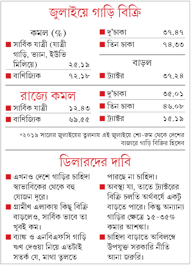 আনলক পর্বে পা রাখার পরে বিশেষ করে সংক্রমণ এড়াতে নিজের গাড়িতে যাতায়াতের জন্য দু’চাকা বা ছোট কম দামি চার চাকার গাড়ির কেনার প্রবণতা স্পষ্ট হয়েছে। কিন্তু গাড়ি সংস্থা ও ডিলার, সকলেরই দাবি, জুলাইয়ের বিক্রি অন্তত সেই প্রবণতার প্রতিফলন নয়। আগের বছরের থেকে অনেক কম। জুনের থেকে যেটুকু বেড়েছে, তা স্বাভাবিক চাহিদার তুলনায় এটাই নগণ্য যে লাভ হয়নি তেমন। তা-ও এই নতুন ক্রেতাদের অধিকাংশই লকডাউনের আগেই গাড়ি কেনার পরিকল্পনা করেছিলেন। তবে গ্রামীণ এলাকায় ভাল বর্ষায় কৃষির উন্নতির আশায় ট্র্যাক্টর ও দু’চাকার গাড়ির চাহিদা বেড়েছে।