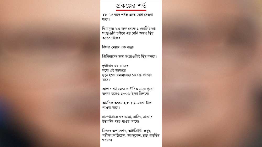 প্রকল্পের প্রিমিয়াম সংস্থাগুলিই স্থির করতে পারবে বলে জানিয়েছে আইআরডিএআই। তার খুঁটিনাটির সঙ্গেই সঙ্গে বলা হয়েছে, সংস্থাগুলি চাইলে এই প্রকল্পকে গোষ্ঠী বিমায় পরিণত করতে পারবে। সে জন্য তার নামে ‘গ্রুপ’ কথাটি জুড়তে হবে।