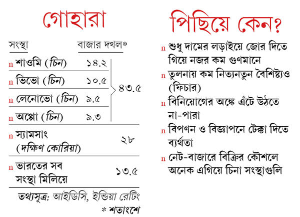 ব্র্যান্ড উপদেষ্টা হরীশ বিজুরের মতে, দামের লড়াইয়ের দিকে একবগ্গা নজর দিতে গিয়ে গুণমানের দিকে কম তাকানোর ভুল করেছে দেশি সংস্থাগুলি। চিনা সংস্থাগুলি যে ভাবে মোবাইলে নিত্যনতুন বৈশিষ্ট্য যোগ করেছে, চেষ্টা করেছে দামি ফোনের ধাঁচে ‘ফিচার’ আনার, এ দেশের সংস্থাগুলি তা করেনি।