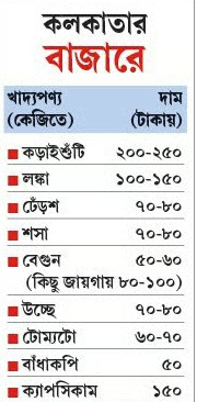 ওয়েস্ট বেঙ্গল ফোরাম অব ট্রেডার্স অর্গানাইজ়েশনসের জেনারেল সেক্রেটারি রবীন্দ্রনাথ কোলেও বলছেন, ‘‘এখনও বেশ কিছু আনাজের দাম বেশ চড়া। তবে আশা, শীতের ফলন বাজারে ঢুকলে তা কমবে।’’ তিনি জানান, সব থেকে বেশি দাম কড়াইশুঁটি, বেগুন, লঙ্কা, ঢেঁড়স, উচ্ছে, শসা, ক্যাপসিকাম ইত্যাদির।