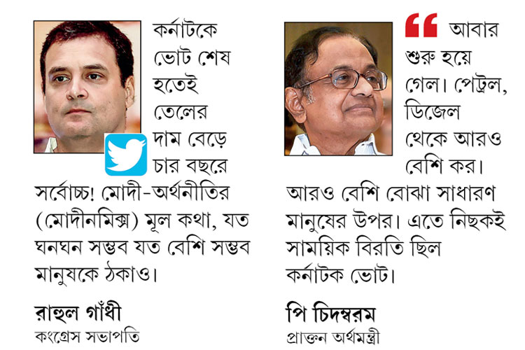 কর্নাটকে ভোট মিটতেই সোমবার পেট্রল, ডিজেলের দাম বেড়েছিল যথাক্রমে ১৮ ও ৫ পয়সা। তা নিয়ে বিরোধীরা কটাক্ষে বিঁধলেন কেন্দ্রকে। কংগ্রেস সভাপতি রাহুল গাঁধীর টুইট, মোদী-অর্থনীতির মূল তত্ত্বই সাধারণ মানুষকে ঠকানো। আর তাঁর দলেরই প্রাক্তন অর্থমন্ত্রী পি চিদম্বরম বললেন, তেলের দামে দৌড় ফের শুরু হল। স্পষ্ট হল, এত দিন তা বাড়েনি কর্নাটক ভোটের কারণেই। তার পরেও অবশ্য মঙ্গলবার জ্বালানি দু’টির দাম বেড়েছে লিটারে ১৫ ও ২২ পয়সা।