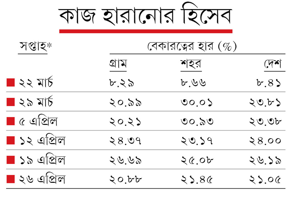 উপদেষ্টা সংস্থা সিএমআইই-র সমীক্ষা অনুযায়ী, ২৬ এপ্রিল শেষ হওয়া সপ্তাহে দেশে বেকারত্বের হার কমল আগের সাত দিনের তুলনায় প্রায় ৫ শতাংশ বিন্দু। দাঁড়াল ২১.০৫ শতাংশে। যেখানে ১৯ এপ্রিল শেষ হওয়া সপ্তাহে ওই হার ছিল ২৬ শতাংশের উপরে। পরিসংখ্যানে স্পষ্ট, বেকারত্বের ছোবল কমেছে গ্রাম, শহর দুই অঞ্চলেই। বেশি কমেছে গ্রামে। দেশ জোড়া লকডাউন শুরুর পর থেকেও শেষ সপ্তাহের বেকারত্বের হারই সব থেকে কম।