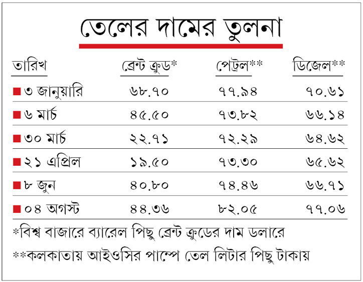 মার্চে কেন্দ্র উৎপাদন শুল্ক বাড়ায় তেলে। লকডাউনে ৮২ দিন অপরিবর্তিত থাকার পরে ৭ জুন থেকে তা টানা বাড়ানো হয়। জুলাইয়ে পেট্রল তেমন না-বদলালেও, ডিজেল বেড়েছে।