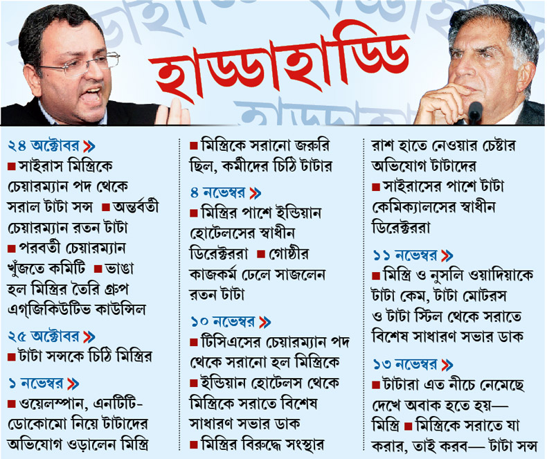 রবিবারই টাটাদের বিরুদ্ধে ফের বিবৃতি দিয়ে তোপ দাগেন গোষ্ঠীর চেয়ারম্যান পদ থেকে সরে যেতে বাধ্য হওয়া সাইরাস মিস্ত্রি। তার জবাবে মিস্ত্রিতে গোষ্ঠীর বিভিন্ন সংস্থার মাথা থেকে সরাতে সব ধরনের ব্যবস্থা নিতে তারা তৈরি বলে জানিয়ে দেয় টাটা সন্সও। টাটা বনাম মিস্ত্রির এই বাগ্যুদ্ধের আবহেই সোমবার আর্থিক ফলাফল ঘোষণা করতে ও সংস্থা পরিচালনার রাশ নিয়ে মতামত জানাতে বৈঠকে বসেছিল টাটা মোটরস পরিচালন পর্ষদ। সোমবার বাদানুবাদও শুরু হয়ে যায় টাটা মোটরসের ছ’জন স্বাধীন ডিরেক্টরের কারও কারও মধ্যে। স্বাধীন ডিরেক্টরদের মধ্যে একজনই মিস্ত্রির সমর্থনে প্রস্তাব দাখিল করেন। কিন্তু বৈঠক শেষে জারি হওয়া বিবৃতিতে সমর্থন জানানো হয়েছে ‘সংস্থা কর্তৃপক্ষকে’।