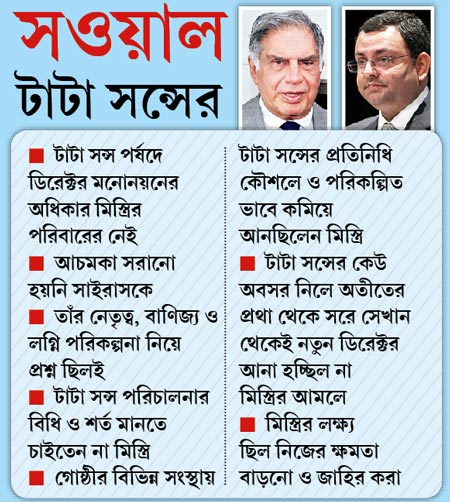১) টাটা সন্সের পরিচালন পর্ষদে ডিরেক্টর মনোনয়ন করার অধিকার মিস্ত্রির পরিবার শাপুরজি পালোনজি-র নেই। টাটা গোষ্ঠীর হোল্ডিং সংস্থা টাটা সন্সে ১৯৮০ সালে শাপুরজি-পালোনজি পরিবারের প্রথম ডিরেক্টর নিযুক্ত হন পালোনজি শাপুরজি মিস্ত্রি। ২০০৪ সালে তিনি অবসর নিলে দু’বছর বাদে ছেলে সাইরাসকে ডিরেক্টর করা হয়। তবে তাঁরা কেউই মনোনয়নের মাধ্যমে টাটা সন্সে আসেননি। সাইরাসকে নিয়োগের প্রস্তাব এনেছিলেন খোদ রতন টাটাই।