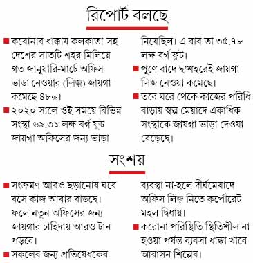 প্রথম দফায় অতিমারির ধাক্কা কাটিয়ে গত জানুয়ারি থেকে কিছুটা ছন্দে ফেরার ইঙ্গিত মিলেছিল আবাসন শিল্পে। তবে মূলত আবাসন বা ফ্ল্যাটের চাহিদার হাত ধরেই নতুন ব্যবসার সন্ধান পেয়েছিল তারা। কিন্তু সমীক্ষা বলছে, ধাক্কা খেয়েছে অফিসের জন্য জায়গা লিজ় বা ভাড়া নেওয়ার চাহিদা। উপদেষ্টা সংস্থা কুশম্যান অ্যান্ড ওয়েকফিল্ডের হিসেব, কলকাতা-সহ দেশের সাতটি শহরে গত বছরের তুলনায় এ বারের জানুয়ারি-মার্চে অফিস লিজ় নেওয়ার হার কমেছে ৪৮%। কলকাতাতেও চাহিদায় টান। এ জন্য অতিমারির দ্বিতীয় ঢেউকেই দায়ী করছে তারা। ফের সংক্রমণ বাড়ায় আগামী কয়েকটি ত্রৈমাসিকেও অফিসের জন্য জায়গা নেওয়ার চাহিদায় ঝিমুনি ভাব থাকবে, আশঙ্কা আবাসন শিল্পের সংগঠন ক্রেডাইয়ের।