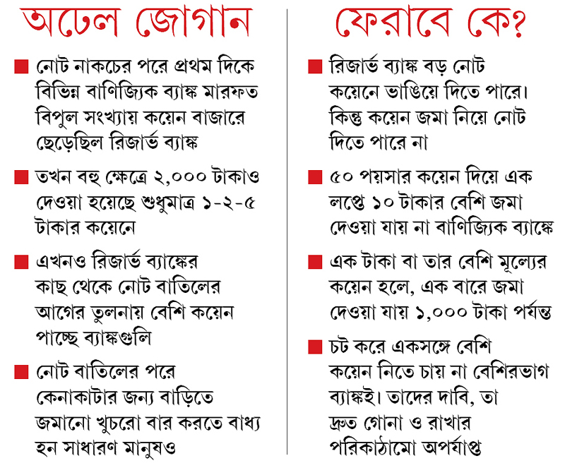 ইউকো ব্যাঙ্ক ইউনিয়নের নেতা এবং পরিচালন পর্ষদের প্রাক্তন সদস্য পার্থ চন্দ্র বলেন, ‘‘আমাদের কাছে যা খবর, নোট বাতিলের পরে তার ঘাটতির খানিকটা কয়েন দিয়ে মিটিয়েছে এবং এখনও মেটাচ্ছে রিজার্ভ ব্যাঙ্ক। ফলে ব্যাঙ্কের মাধ্যমে বাজারে কয়েন সরবরাহ বেড়েছে।’’