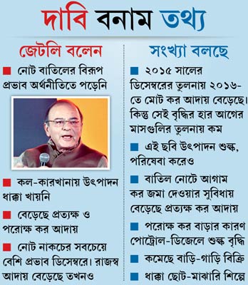 প্রাক্তন প্রধানমন্ত্রী মনমোহন সিংহ, নোবেলজয়ী অর্থনীতিবিদ অমর্ত্য সেন থেকে শুরু করে ছোট ও মাঝারি শিল্প— নোট বাতিলের সিদ্ধান্তে অর্থনীতি ধাক্কা খাচ্ছে বলে অভিযোগ তুলছেন সকলেই। এই পরিস্থিতিতে জেটলির দাবি ছিল, নোট বাতিলে অর্থনীতি ধাক্কা খায়নি। ২০১৫ সালের ডিসেম্বরের তুলনায় ২০১৬-র শেষ মাসে কর আদায় বেড়েছে ৩১%। এপ্রিল থেকে ডিসেম্বর—অর্থবর্ষের প্রথম ন’মাসে আয়কর, কোম্পানি করের মতো প্রত্যক্ষ কর আদায় বেড়েছে ১২.০১%। আর উৎপাদন শুল্ক, পরিষেবা করের মতো পরোক্ষ কর বেশি এসেছে ২৫%। এমনকী তা বেড়েছে ডিসেম্বরেও। নোট নাকচের প্রভাব যে-মাসে সবচেয়ে বেশি থাকার কথা। তাঁর যুক্তি, অর্থনীতি সত্যিই ধাক্কা খেলে এমন ঘটত না।