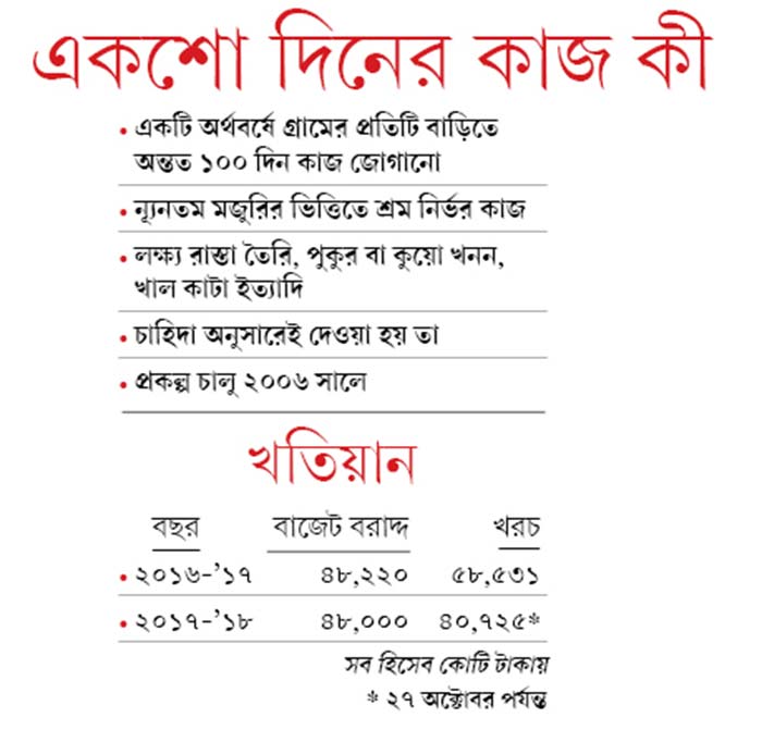 গত বছরের ৮ নভেম্বর নোট বাতিল হয়। নগদ মজুরি দিতে না-পেরে আবাসন থেকে শুরু করে বেশ কিছু ছোট-মাঝারি সংস্থা ঝাঁপ ফেলতে শুরু করে। তার ধাক্কাতেই গ্রামে ফিরতে শুরু করেন কাজ হারানো শ্রমিকরা। একশো দিনের কাজের চাহিদা বেড়ে যায়। তার জেরেই এই প্রকল্পে আদতে খরচ হয়েছে ৫৮,৫৩১ কোটি টাকা।