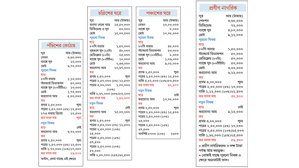 * সব কাল্পনিক উদাহরণেই কর বাবদ দায়ের উপরে যোগ হবে ৪% হারে শিক্ষা ও স্বাস্থ্য সেস।