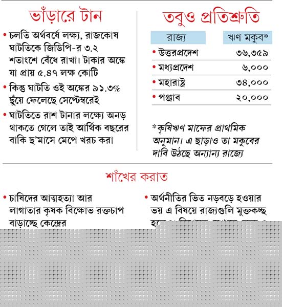 দরজায় কড়া নাড়ছে গুজরাত ভোট। ঘর গোছানোর সময় এগিয়ে আসছে লোকসভা নির্বাচনেরও। এই অবস্থায় কৃষিঋণ মকুবের দাবিতে চাষিদের আত্মহত্যা আর কৃষক বিক্ষোভ রক্তচাপ বাড়াচ্ছে কেন্দ্রের। কিন্তু সেই ক্ষোভে জল ঢালতে ঋণ মকুবের জন্য বিপুল অঙ্ক চট করে জোগাড় করাও কঠিন কেন্দ্রের পক্ষে। কারণ, তাতে নড়ে যেতে পারে রাজকোষ ঘাটতিতে লাগাম টেনে রাখার চাঁদমারি। হালে মূল্যায়ন সংস্থা মুডি’জ-এর রেটিং এক ধাপ ওঠার পরে যা করা আরও কঠিন মোদী সরকারের পক্ষে।