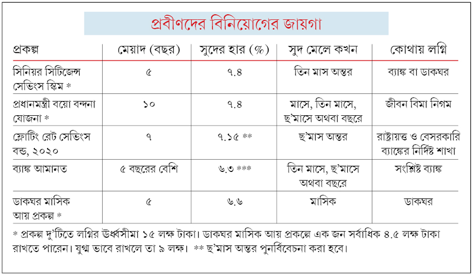 • ব্যাঙ্ক ও ডাকঘরে সুদ যে জায়গায় পৌঁছেছে, সেই বিচারে আকর্ষণ বাড়বে নতুন করে বাজারে আনা ভারত সরকারের পরিবর্তনশীল সুদের বন্ডের। আগের বন্ডের চেয়ে এর সুদ কম। বর্তমানে তা ৭.১৫% ও মিলবে ছ’মাস অন্তর। তবে এই সুদ করযোগ্য। তা ছাড়া প্রতি ছ’মাসে তা পর্যালোচনা করা হবে। ফলে ভবিষ্যতে তা কমতেও পারে, তেমনই বাড়ার সম্ভাবনাও রয়েছে। কেন্দ্রের প্রকল্প হওয়ায় সুরক্ষা তুলনায় বেশি। তবে ৭ বছর মেয়াদের এই বন্ড আগে ভাঙানোর সুযোগ কম। প্রবীণরা কোথায় লগ্নি করতে পারেন, তা রইল সঙ্গে সারণিতে।