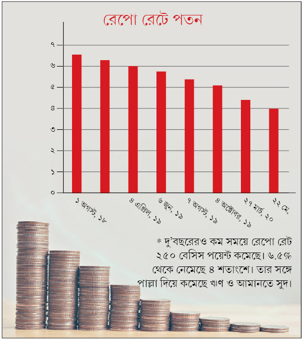 একটু হিসেব করলেই দেখা যাবে রিজার্ভ ব্যাঙ্ক ২০১৯ সালের ফেব্রুয়ারি থেকে টানা সুদ কমানোর ফলে ব্যাঙ্কগুলি যে হারে সুদ কমিয়েছে, তাতে ঋণের চেয়েও বেশি সুদ কমেছে আমানতে। গত দেড় বছরের ছাঁটাইয়ের হাত ধরে কিছু বড় ব্যাঙ্কের আমানতে সুদ নেমে এসেছে ৫.৫ শতাংশের আশেপাশে। প্রবীণদের ক্ষেত্রে বড়জোড় ৬.২৫%। এ দিকে লকডাউনের জেরে মূল্যবৃদ্ধি পৌঁছে গিয়েছে ৬ শতাংশের উপরে। অর্থাৎ, কর বাদ দিয়ে আমানত থেকে হাতে আসা টাকার পুরোটাই খরচের খাতায় যাচ্ছে। সঞ্চয়ের ঝুলিতে নয়।