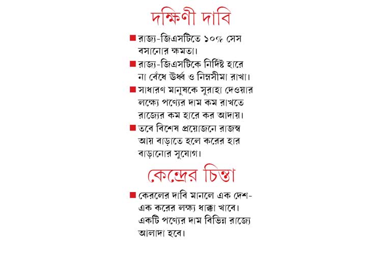 তবে কেন্দ্রীয় অর্থ মন্ত্রক কর্তাদের যুক্তি, কেরলের দাবি মানলে জিএসটির মূল মন্ত্র, ‘এক দেশ-এক কর’ ব্যবস্থা ধাক্কা খাবে। পণ্যের দাম এক এক রাজ্যে এক এক রকম হবে। জটিলতা দেখা দেবে কর প্রক্রিয়ায়।