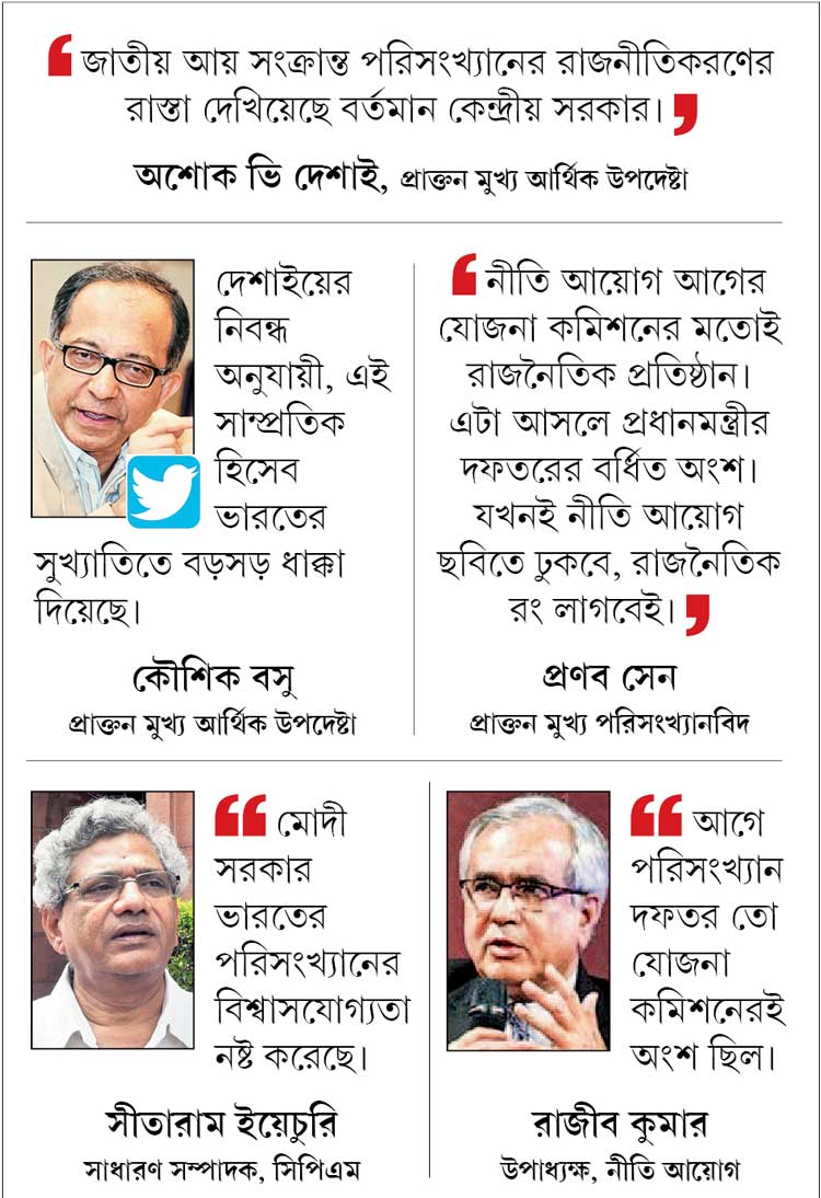অর্থ মন্ত্রকের প্রাক্তন মুখ্য উপদেষ্টা অশোক ভি দেশাই অভিযোগ তুলেছেন, ‘‘জাতীয় আয় সংক্রান্ত পরিসংখ্যানের রাজনীতিকরণের রাস্তা দেখিয়েছে বর্তমান কেন্দ্রীয় সরকার।’’ নীতি আয়োগের মতো রাজনৈতিক প্রতিষ্ঠানের উপাধ্যক্ষ যে ভাবে সাংবাদিক বৈঠক করে কেন্দ্রীয় পরিসংখ্যান দফতরের তথ্য প্রকাশ করেছেন, এক নিবন্ধে তা নিয়েই প্রশ্ন তুলেছেন তিনি। দেশাইয়ের এই মন্তব্য তুলে ধরে প্রাক্তন মুখ্য আর্থিক উপদেষ্টা কৌশিক বসু টুইট করেছেন, ‘‘দেশাইয়ের নিবন্ধ অনুযায়ী, এই সাম্প্রতিক হিসেব ভারতের সুখ্যাতিতে বড়সড় ধাক্কা দিয়েছে।’’ তাঁর মতে, শুধু উন্নয়নশীল দেশগুলির মধ্যে নয়, গোটা বিশ্বেই অর্থনীতির পরিসংখ্যান ও তার হিসেবের প্রক্রিয়ার জন্য ভারত সকলের থেকে আলাদা ছিল।