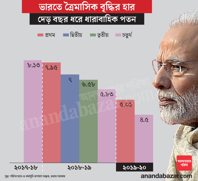 মোদী সরকার ক্ষমতায় ফিরে ৫ লক্ষ কোটি ডলারের অর্থনীতির স্বপ্ন দেখিয়েছিল। কিন্তু গত ছ’বছরে অর্থনীতির অবস্থা এতখানি খারাপ হয়নি। ২০১২-১৩-র জানুয়ারি-মার্চে বৃদ্ধির হার ৪.৩ শতাংশে নেমে এসেছিল। সেই অর্থ বছরে বৃদ্ধির হার মাত্র ৪.৫ শতাংশ ছিল। চলতি অর্থ বছরের প্রথম তিন মাস, এপ্রিল থেকে জুনে বৃদ্ধির হার ছিল ৫ শতাংশ। পরের তিন মাসে তা ৪.৫ শতাংশে নেমে আসায় এই অর্থ বছরে বৃদ্ধির হার ৬ শতাংশের গণ্ডি টপকাতে পারবে কি না, তা নিয়েই আশঙ্কা দেখা দিয়েছে। কারণ অর্থ বছরের প্রথম ছয় মাসে বৃদ্ধির হার মাত্র ৪.৮ শতাংশ। যা গত বছরে ছিল ৭.৫ শতাংশ।