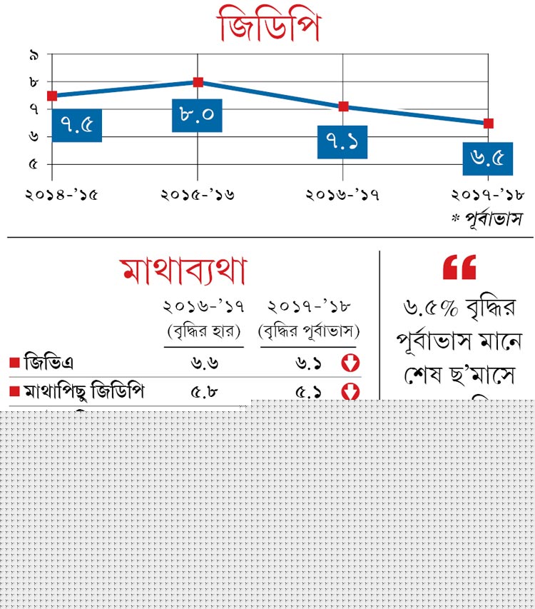 আর্থিক বছরের শুরুতে করা ৭.৩% তো দূর অস্ত্, পরে বলা ৬.৭% পূর্বাভাস ধরে রাখা থেকেও পিছিয়ে আসতে বাধ্য হল কেন্দ্র। মুখ্য পরিসংখ্যানবিদ কার্যত মেনেওছেন যে, জিএসটি চালুর ধাক্কা এখনও কাটিয়ে উঠতে পারেনি অর্থনীতি।