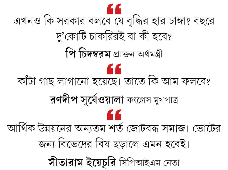 কংগ্রেস মুখপাত্র রণজিৎ সূর্যেওয়ালার মতে, এক জন দাম্ভিক প্রধানমন্ত্রী আর ব্যর্থ অর্থমন্ত্রীর যুগলবন্দিই সর্বনাশের পথে ঠেলে দিয়েছে দেশের অর্থনীতিকে। তাঁর কথায়, ‘‘কাঁটা গাছ লাগানো হয়েছে। তাতে কি আম ফলবে?’’ আর সিপিআইএম নেতা সীতারাম ইয়েচুরির কথায়, ‘‘আর্থিক উন্নয়নের অন্যতম প্রধান শর্তই হল, জোটবদ্ধ সমাজ। ভোটের জন্য বিভেদের বিষ ছড়ালে এমন হবেই।’’