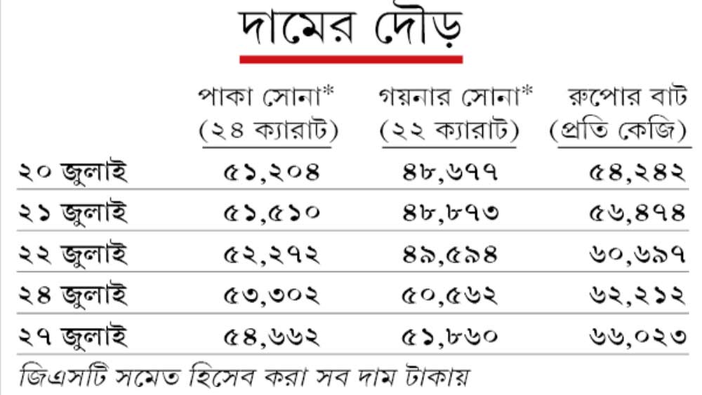 বিশেষজ্ঞেরা বলছেন, করোনার আবহে শেয়ার, ফান্ড বা মুদ্রা বাজার চূড়ান্ত অনিশ্চিত বলেই লগ্নিকারীরা আঁকড়ে ধরছেন সুরক্ষিত লগ্নির বর্ম সোনাকে। একই কারণে অনেকের পছন্দ রুপোও। ফলে সাধারণ রোজগেরেদের নাগালের বাইরে তারা। প্রতি কেজি রুপোর বাট এ দিন ৩৮১১ টাকা বেড়ে হয়েছে ৬৬,০২৩। রুপোর রেকর্ড দাম অবশ্য ৭৪,০০০ টাকা। ২০১১ সালের ২৪ এপ্রিল ছুঁয়েছিল।