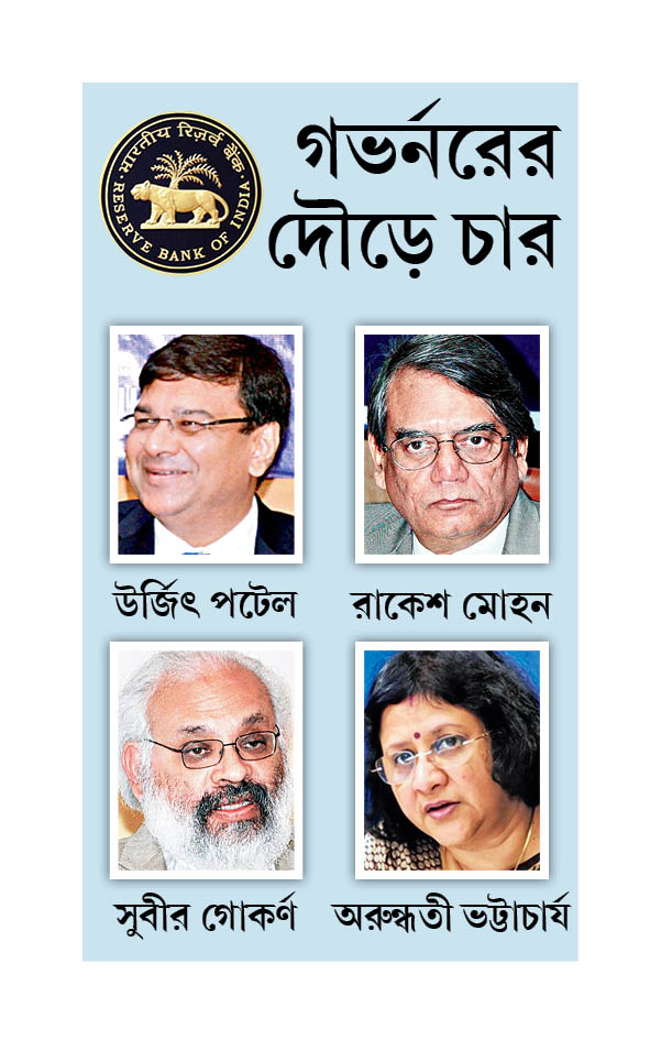 সরকারি সূত্রে খবর, প্রাথমিক ভাবে বাছাই তালিকায় রয়েছেন— (১) জানুয়ারিতেই রিজার্ভ ব্যাঙ্কের ডেপুটি গভর্নর পদে মেয়াদ বাড়া উর্জিৎ পটেল (২ ও ৩) দুই প্রাক্তন ডেপুটি গভর্নর রাকেশ মোহন ও সুবীর গোকর্ণ (৪) স্টেট ব্যাঙ্কের কর্ণধার অরুন্ধতী ভট্টাচার্য।
