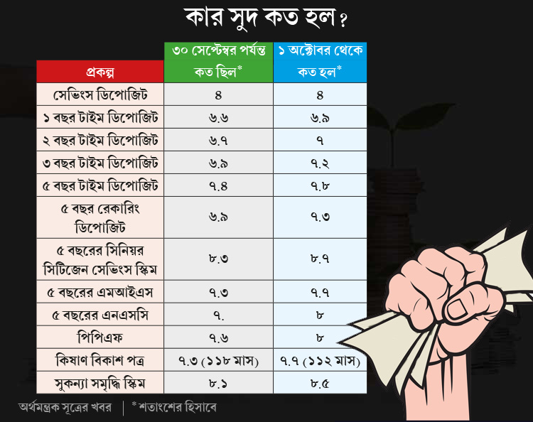 অর্থমন্ত্রকের ঘোষণা অনুযায়ী, এ বার পিপিএফে সুদের হার ৭.৬ শতাংশ থেকে বেড়ে হল ৮ শতাংশ। এনএসসি-তে ৭.৬ শতাংশ থেকে বেড়ে হল ৮ শতাংশ। কিষাণ বিকাশ পত্রের সুদের হার হল ৭.৭ শতাংশ। কিষাণ বিকাশ পত্রের মেয়াদ সম্পূর্ণ হওয়ার সময়সীমাও কমানো হয়েছে। ১ অক্টোবর থেকে ১১৮ মাসের বদলে ১১২ মাসে কিষাণ বিকাশ পত্রের মেয়ার সম্পূর্ণ হবে। আর সুকন্যা সমৃদ্ধি অ্যাকাউন্টের সুদের হার বেড়ে হল ৮.৫ শতাংশ।