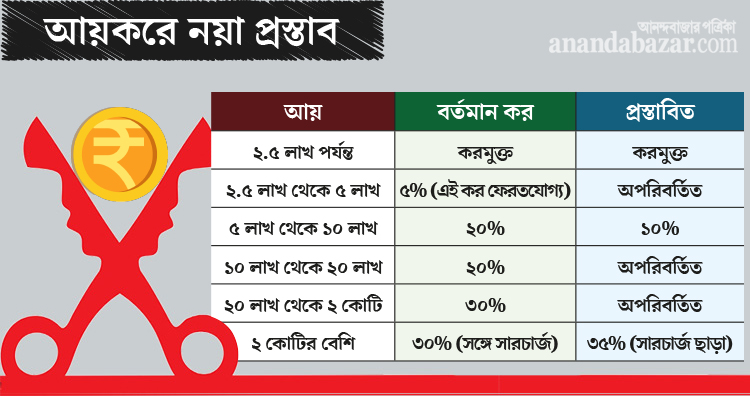 ওই সূত্রটি জানাচ্ছে, টাস্ক ফোর্সের প্রস্তাব— বছরে যাঁদের আয় ৫ থেকে ১০ লক্ষ টাকা পর্যন্ত তাঁদের করের হার হোক ১০ শতাংশ। ১০ থেকে ২০ লক্ষ পর্যন্ত ২০ শতাংশ, ২০ লক্ষ থেকে ২ কোটি পর্যন্ত ৩০ শতাংশ এবং ২ কোটির বেশি আয় করলে ৩৫ শতাংশ করের প্রস্তাব দিয়েছে টাস্ক ফোর্স।