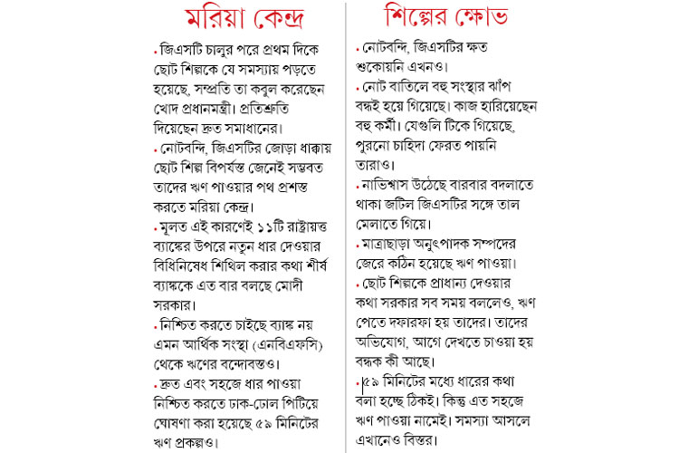শিল্প মহলের একাংশের অভিযোগ, প্রধানমন্ত্রী নরেন্দ্র মোদী পূর্ব ও উত্তর-পূর্বাঞ্চলকে বাড়তি গুরুত্ব দেওয়ার কথা বলেন ঠিকই। কিন্তু নোট বাতিল ও জিএসটিতে সমস্যায় পড়েছে সেখানকার ছোট শিল্প। গর্গের আশ্বাস, ‘‘প্রথমে কিছু সমস্যা হলেও জিএসটির অনেক ইতিবাচক দিক রয়েছে। আশা করি এ বছর ভাল কাটবে।’’